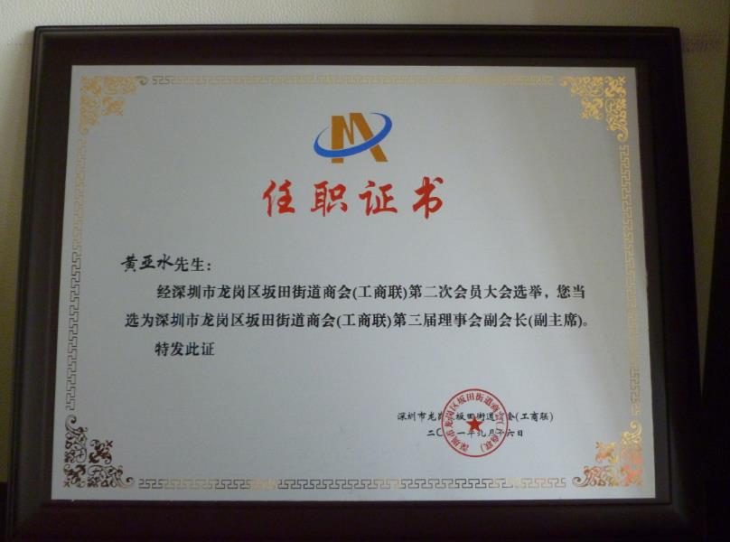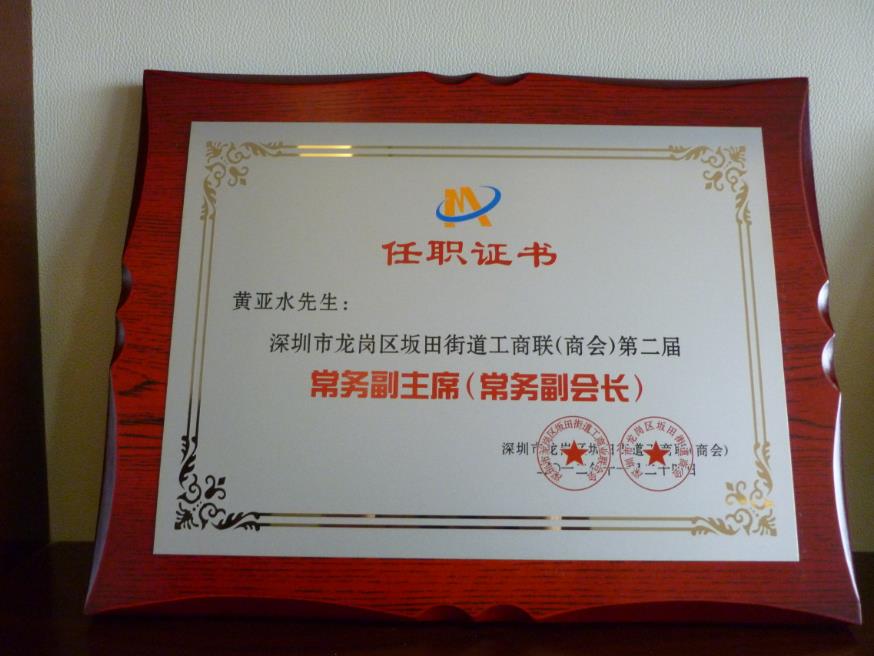 擔(dān)任深圳市龍崗區(qū)坂田街道商會(huì)理事會(huì)副會(huì)長(zhǎng)